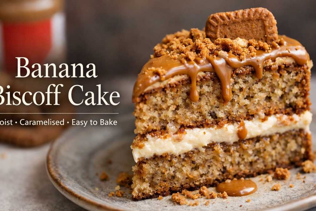 Banana Biscoff cake is a moist banana-based cake flavoured with Lotus Biscoff spread, which adds caramelised, spiced biscuit notes. The cake is typically finished with Biscoff buttercream, cream cheese icing, or a Biscoff drizzle for added richness.