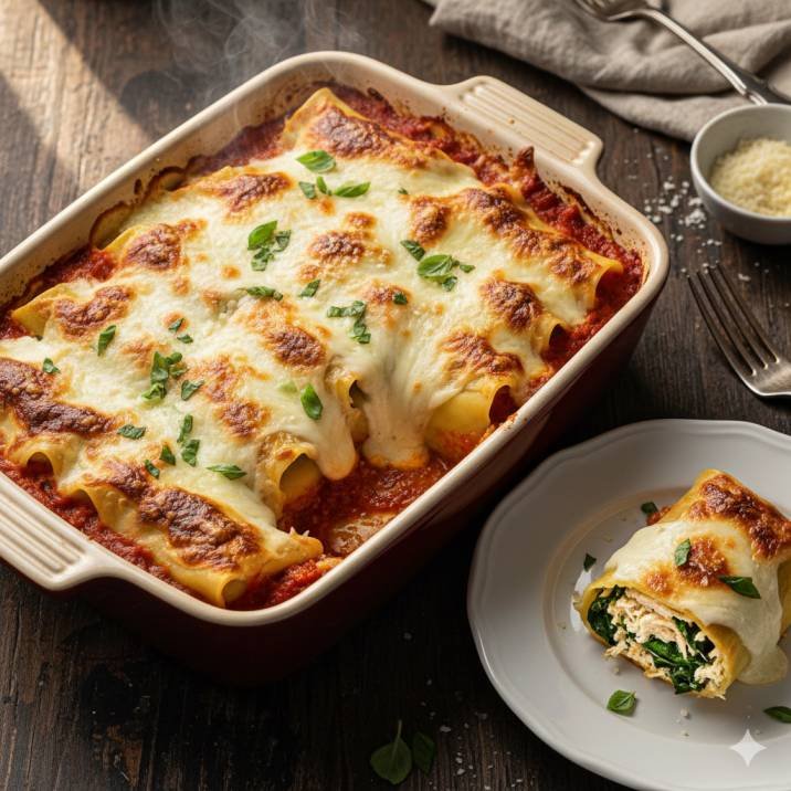 Chicken cannelloni is a comforting baked pasta filled with tender chicken, creamy ricotta and spinach, rolled in fresh pasta sheets and baked with marinara and mozzarella. This recipe delivers rich flavor, soft texture and an impressive finish—perfect for family dinners, gatherings or any moment that calls for something hearty and memorable.