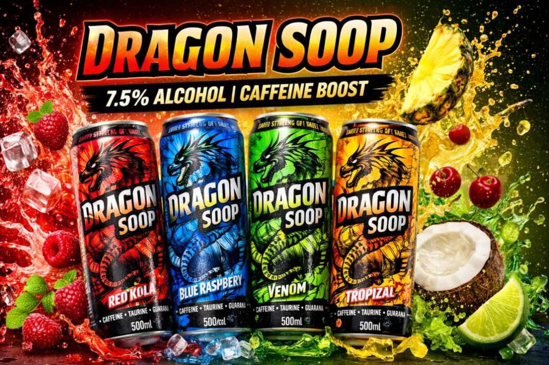 Dragon Soop is a high-strength caffeinated alcoholic beverage sold in 500 ml cans with 7.5% ABV, combining alcohol with stimulants such as caffeine, taurine and guarana to create a powerful ready-to-drink option for adults. Its bold fruit flavours, high alcohol content and budget-friendly price have helped it gain rapid popularity among adult drinkers across the UK. while also raising important conversations about responsible consumption and safe drinking practices.